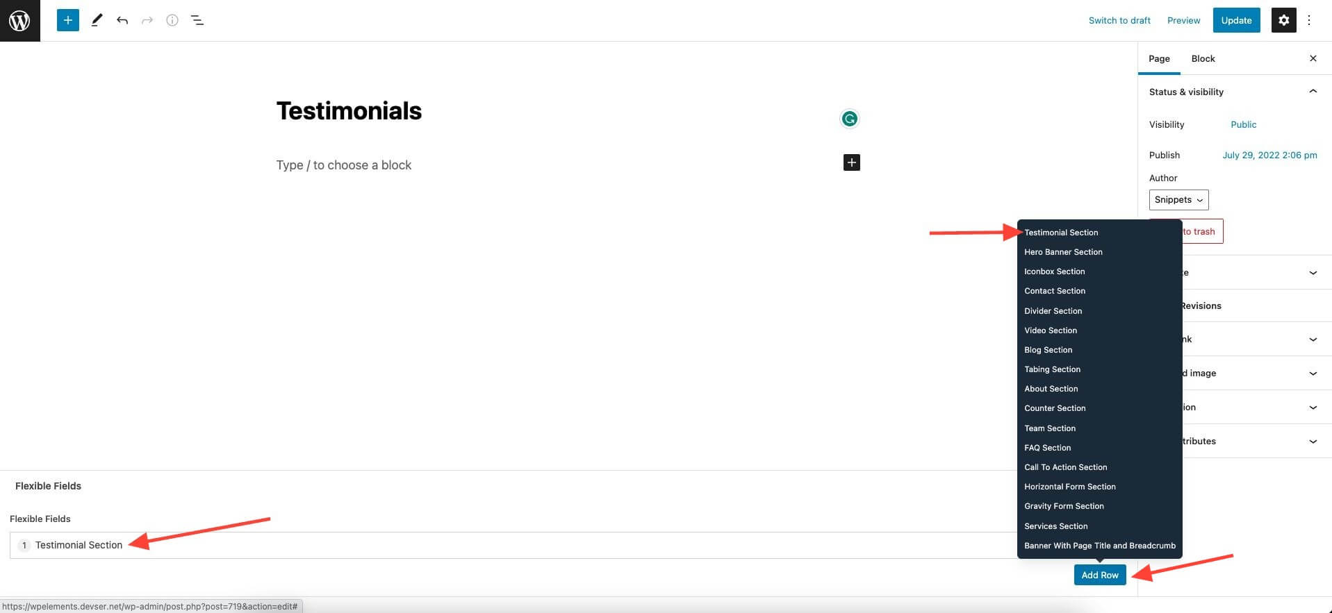 Step 4: The Flexible Content field will now be visible on the page edit screen, along with the various other sections that were created.