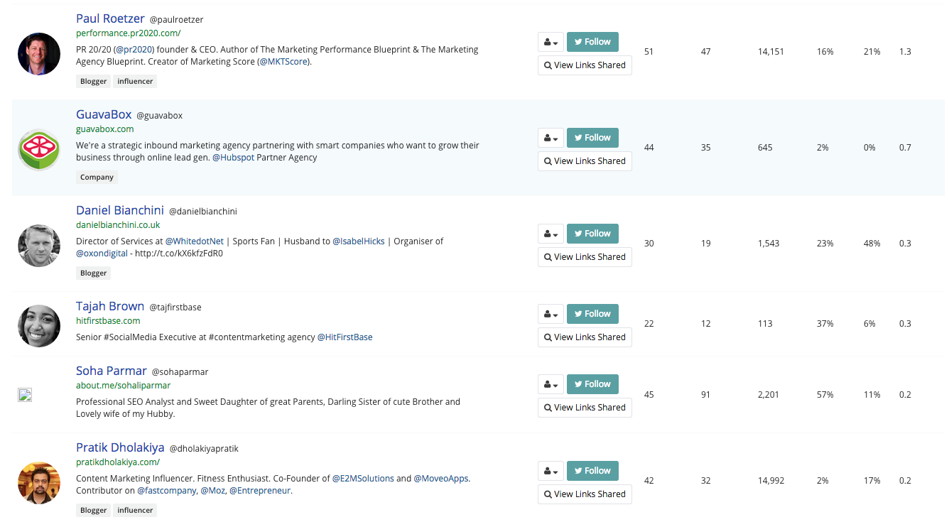 It shows you: how many times an article has been shared, where it’s been shared, who shared it and shows vital information about those people that you’re going to use right now.