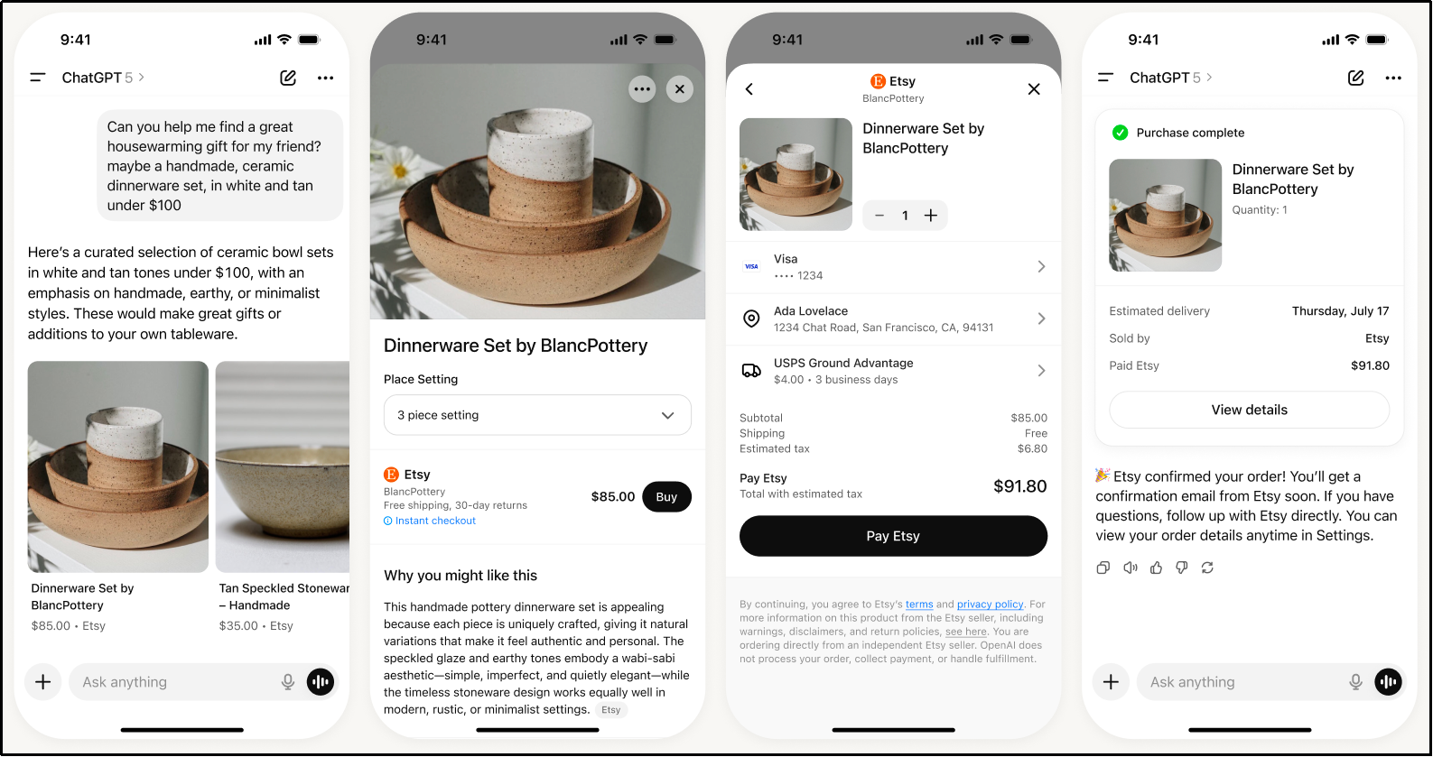 • Instant Checkout removes friction: Users can complete purchases directly in ChatGPT without redirects