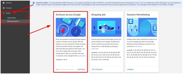 For e-commerce selling purposes, you will likely want to select “Surfaces across Google”. This will show your product listings on the Shopping tab, Google Images, and the Search Index in the countries or regions that you want to sell to.