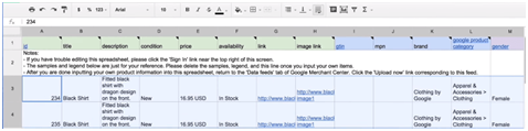 Next, you will need to fill in the product information. It is recommended that you use the Google Sheet form that is automatically provided. This is essentially a spreadsheet where you can copy and paste in product attributes. This is also where you will include an image link.