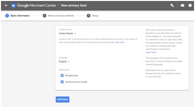 To do this, you will select “Products” then “Feeds” from the Merchant Center menu. You will then register a new primary feed, which will prompt you to enter information like the country of sale, language, and destination.